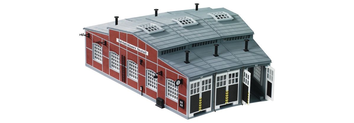 Viele Einzelteile zur individuellen Ausschmückung liegen bei. Die Tore werden unabhängig voneinander durch ein- und ausfahrende Loks automatisch geschlossen und geöffnet. Mehrere Ringlokschuppen können beliebig aneinandergesetzt werden. Auf der Rückseite des Lokschuppens befindet sich ein Tor, das zum Durchfahren geöffnet werden kann.